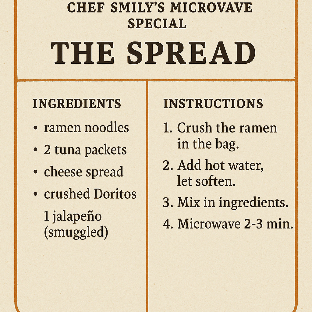 Born of commissary ingenuity and a refusal to eat blandly, The Spread is less a recipe and more a survival ritual. This is what happens when ramen gets crushed with purpose, tuna finds companionship, and Doritos are promoted from snack to structural ingredient. Add a swipe of cheese spread for cohesion, a jalapeño for courage (acquired… creatively), and a microwave to perform the final act of culinary alchemy. Eat slowly. Share if you trust the person. And never underestimate what can be built from scraps when hunger meets imagination.